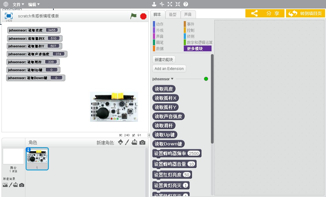 单击“好好搭搭传感器板”程序作品右上角的“转到设计页”按钮,会进入这个作品的“设计页”。这个网页与普通Scratch作品设计页基本相同,最大的区别在于“脚本选项卡”的“更多模块”,在这个指令类别中,添加了许多控制“好好搭搭传感器板”的指令。