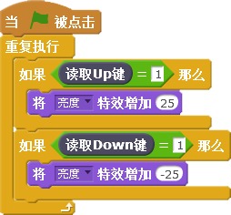 程序代码编写完成后,如果按下传感器板上的“Up”按键,会增加舞台背景图片的亮度,如果按下“Down”按键,会降低舞台背景图片的亮度。