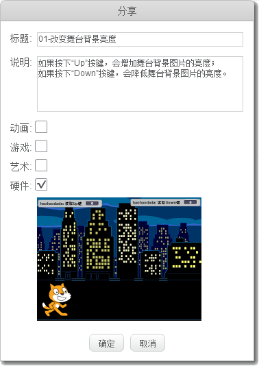 对于保存在“好好搭搭”网站上的传感器程序,也可以单击“文件”菜单栏中的“分享”选项,在打开的“分享”对话框中输入这个传感器程序作品的说明文字、勾选程序类别为“硬件”,最后单击“确定”按钮将程序在网站上分享。