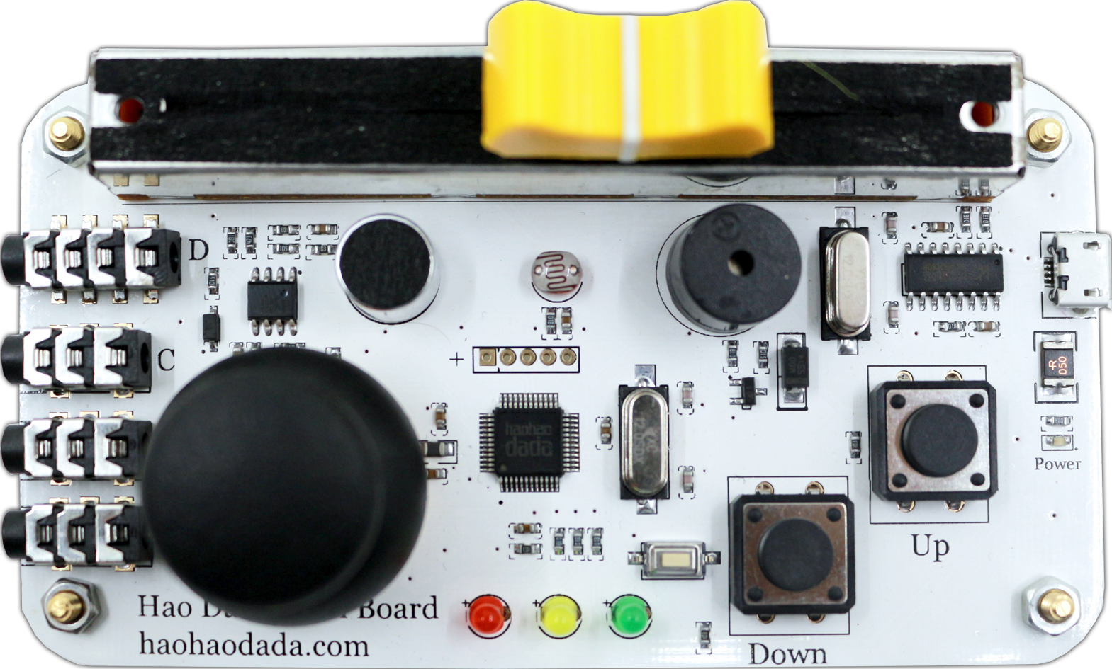 在你所使用的“好好搭搭传感器板”上,找到按键、滑杆、亮度、声音、摇杆这些传感器以及蜂鸣器、LED。"