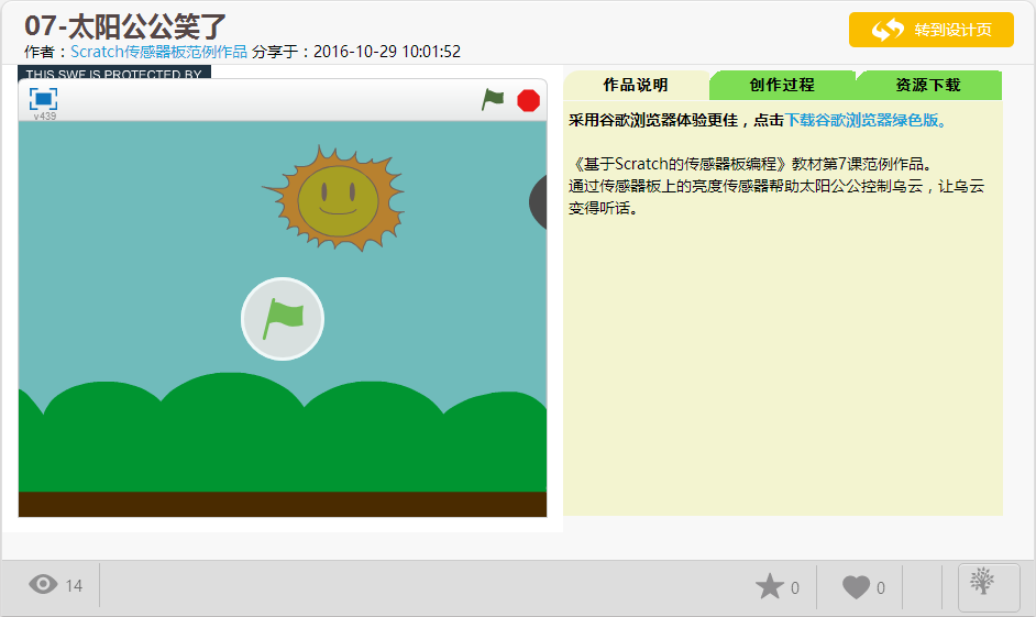 与普通Scratch程序作品一样,传感器板程序作品也是由作品名称、作者信息、作品预览以及作品说明等内容组成。但与普通Scratch不同的是,直接单击“开始旗”,程序不会正常运行,这是由于这些程序作品都是基于“好好搭搭传感器板”开发的,在使用之前必须连接传感器板。