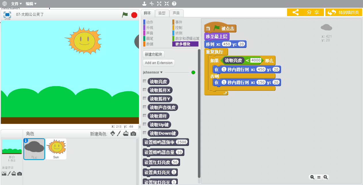 利用“好好搭搭”网站编写传感器板程序非常方便,下面就以一个简单改变舞台背景亮度的程序为例,了解使用“好好搭搭传感器板”在线编写程序的方法与步骤: