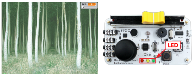 在本课的范例作品中,可以通过拖动“烟雾”变量滑杆,模拟森林里的烟雾浓度,作为火灾预警的依据。如果没有烟雾,绿色LED亮,表示森林安全;如果有烟雾但还在安全范围内,黄色LED亮,提示森林存在安全隐患;如果烟雾超过一定范围,即将引发火灾,红色LED亮,提示森林存在危险。