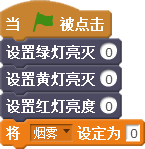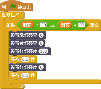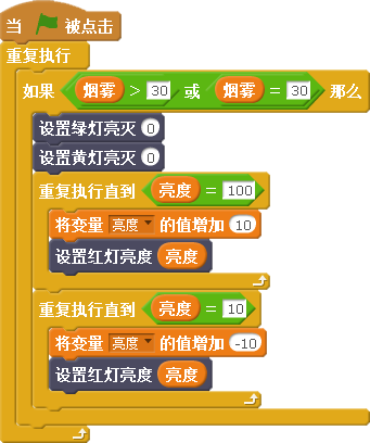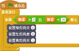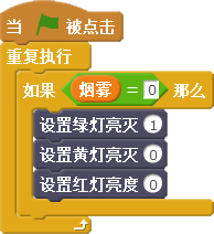 首先将“当绿旗被点击”和“重复执行”指令组合在一起,然后使用“判断”指令进行判断:如果“烟雾”=“0”时,那么绿色LED“亮”,其他LED“灭”。