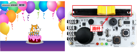 要完成本课范例,可以先添加舞台、角色,设置舞台和角色的初始状态;然后根据音乐的音量与滑杆参数值、房间亮度与滑杆值参数之间的关系,通过传感器板上的滑杆调整生日晚会的音乐和灯光,滑杆值越大,音乐越响,灯光越亮。