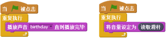 第二段代码如上右图所示,用于实现通过滑杆调整音乐的音量大小。也就是通过滑动传感器板上的滑杆,可以改变音乐的音量大小。要实现这个效果,可以在舞台脚本代码中,将“读取滑杆”指令组合到“音量设定”指令的参数框内,具体脚本代码如上右图所示。