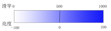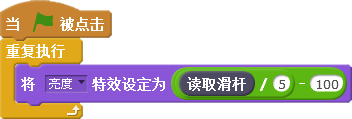在本课的范例作品中,通过传感器板上的滑杆还可以改变背景图片的亮度。与用滑杆控制音量一样,用滑杆控制背景图片亮度,也需要先找到它们之间的转换公式。但与控制音量不一样的是:图片亮度的取值范围是(-100,100),是由一段负数、一段正数组成的,因此滑杆和亮度的数值不能直接相除。如下图所示: