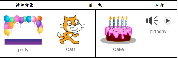 通过“背景库”对话框添加“派对”(party)图片作为舞台背景;再通过“角色库”对话框添加小猫(Cat1)、蛋糕(Cake)角色;调整这两个角色的大小、将它们拖动到舞台的合适位置。