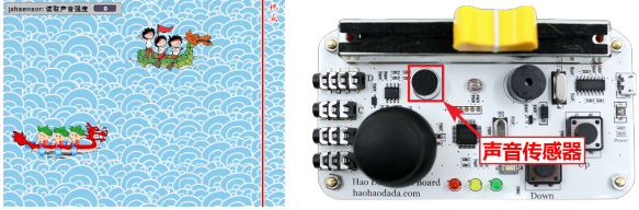 “龙舟2”是由传感器板上的声音传感器所获取的声音强度控制的。为了获得比较好的控制效果,应该先测量“安静”和“加油”这两种环境下声音传感值的变化范围。