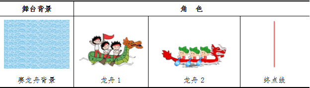 按钮,通过“打开”对话框分别上传刚才下载并解压缩到文件夹中的“龙舟1”、“龙舟2”图片;再单击“角色列表区”工具栏中的“绘制新角色”按钮,在“造型”选项卡中绘制一条红线作为比赛的“终点线”;调整这三个角色的位置,使两条龙舟在舞台左侧、红色“终点线”在舞台右侧。