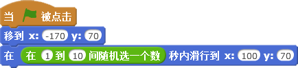 “龙舟1”是由软件自动控制的,先将它移动到合适的起点位置,观察它的坐标值,其中X值大致为“-170”,y值大致为“70”;再将龙舟向终点方向移动,触碰到终点线,这时X值大致为“100”,y值可以保持不变。为了让比赛更精彩,可以设置“龙舟1”的移动速度是1-10秒之间的随机数。具体的脚本代码如下图所示。