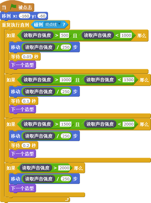 在本课范例中,经过尝试得出声音强度变化的大致范围为(500,2000)。