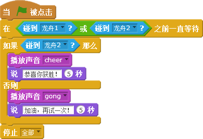 比赛结果是由“终点线”角色完成的,哪艘龙舟先碰到“终点线”,哪艘龙舟就获胜,在没有龙舟碰到之前一直等待。当有龙舟碰到“终点线”就判断:如果是龙舟2先碰到,就说“恭喜你获胜”,同时播放胜利的音乐;否则说“加油,再试一次”,并播放失败的音乐;音乐播放完毕后停止所有程序。