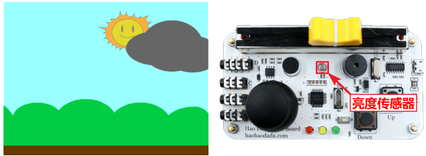 太阳公公最近有点心烦,因为乌云不断来骚扰它,总是偷偷过来遮住它的脸,让它看不清蓝天、白云与绿色的大地。本课我们将通过传感器板上的亮度传感器帮助太阳公公控制乌云,让乌云变得听话。