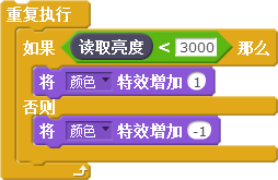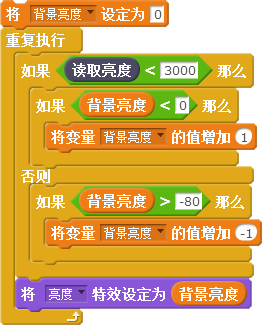 正确的办法是控制背景“亮度”特效值的变化范围,一般可以在(0,-80)之间变化。因此先创建一个“背景亮度”变量,设置这个变量初始值为“0”,也就是正常的亮度特效值;然后进行判断:在亮度传感器数值小于3000时,表明周围光线充足,这时如果“背景亮度”变量值小于0,那么应该将“背景亮度”变量值“+1”;如果亮度传感器的值大于3000,表明周围光线较暗,这时如果“背景亮度”变量值大于-80,那么应该将“背景亮度”变量的值“-1”。最后根据“背景亮度”变量的数值设置亮度特效。具体脚本代码如下图所示。