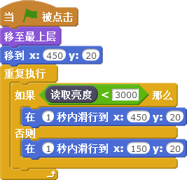 在本课的范例作品中,环境的正常亮度是“3000”左右,当传感器板上的亮度值小于3000时,说明环境比较亮;大于3000时,环境比较暗。