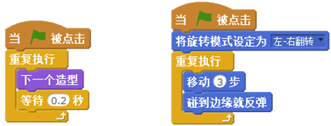 其中第一段脚本如下左图所示,通过造型切换扇动翅膀;第二段脚本如下右图所示,控制鹦鹉在舞台上移动。这两段脚本运行以后,鹦鹉能够在舞台上沿直线飞行、碰到边缘就反弹,飞行的时候还能够扇动翅膀,效果可以更加逼真。