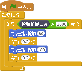 第三段脚本重复执行条件判断:如果扩展口A(也就是触摸传感器模块连接的扩展口)所读取的数值大于指定值,那么通过增、减y坐标值,让鹦鹉飞行中产生上、下跳跃的动画效果。
