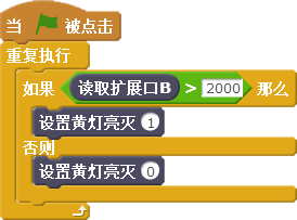 要用人体红外传感器模块控制LED亮灭,就要重复执行条件判断:如果扩展口B(也就是人体红外传感器模块连接的扩展口)所读取的数值大于指定值,那么就设置LED亮,否则就设置LED灭。具体程序脚本如下图所示。