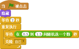 范例游戏中的恶魔通过克隆,从舞台的右侧不断向左侧飞行,向小卫士进攻。它的第一段脚本是先设置隐藏,然后不断的克隆自己。