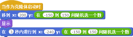 第二段脚本是当恶魔作为克隆体启动后,先在舞台右侧的随机起始位置显示,然后向舞台左侧的随机终点位置飞行。