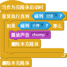 第三段脚本是当恶魔作为克隆体启动后,如果在飞行过程中碰到子弹,就删除这个克隆体、播放被击中的声音;如果没有碰到子弹,飞行到舞台边缘时,也删除克隆体。