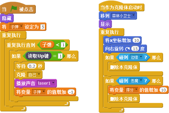第二段脚本是当“子弹”作为克隆体启动后,先移动到“森林小卫士”角色边上显示,然后使用重复执行指令:让“子弹”向右移动、同时旋转产生动态效果,增加游戏趣味性;同时判断子弹克隆体在飞行过程中,如果碰到恶魔或者舞台边缘,都删除克隆体。具体脚本代码如上右图所示。