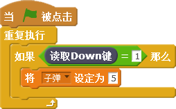 第三段脚本是检测有没有按下传感器板上的“Down”键,如果按下了,那么重新设置子弹数量为5。具体脚本代码如下图所示。