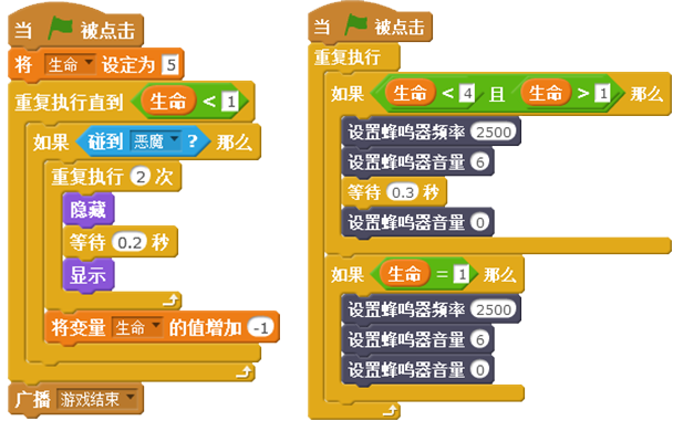为了增加游戏的可玩性,还可以设置游戏的生命系统。本课范例游戏中,当森林小卫士被恶魔碰到,它的生命值就会减少,当生命值为零的时候,游戏失败。随着生命值的减少,传感器板上的蜂鸣器可以发出不同的警报声音。