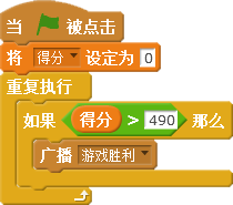首先选中舞台背景缩略图,新建“得分”变量、设置“得分”变量的初始值为0;然后在重复指令中判断:如果得分变量大于490(也就是达到500分),就广播“游戏胜利”。具体脚本代码如下图所示。