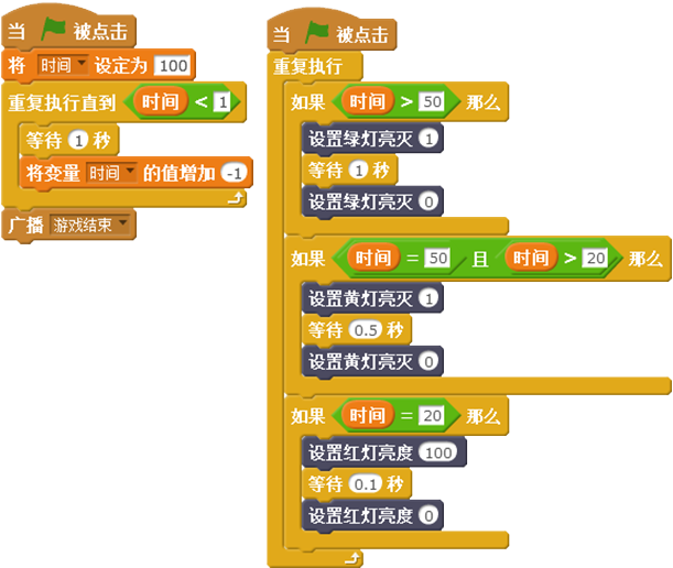 还可以在舞台脚本中添加传感器板上的LED灯提示脚本:当时间大于50秒时,绿灯闪烁;当时间等于50并且大于20时,黄灯闪烁;当时间等于20时,红灯闪烁。具体脚本代码如上右图所示。