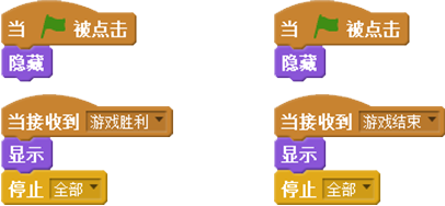本课范例游戏一开始,“游戏胜利”和“游戏结束”文字角色隐藏;当接收到“游戏胜利”或者“游戏结束”消息时,显示相应角色。具体这两个角色的脚本代码如下图所示: