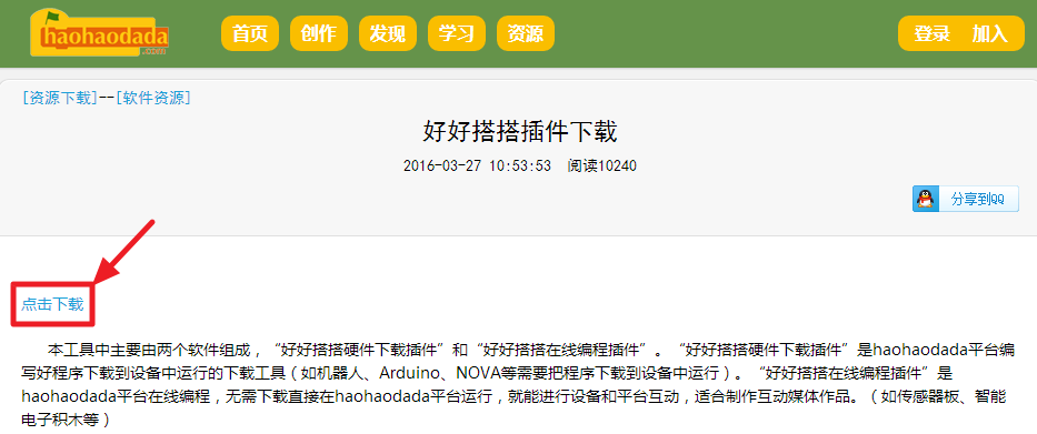 在“好好搭搭插件下载”网页中,单击插件介绍文字上方的“点击下载”文字,将安装文件下载、保存到本地计算机。