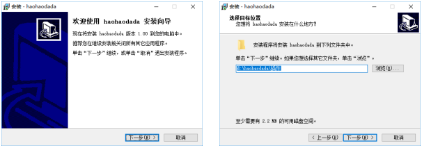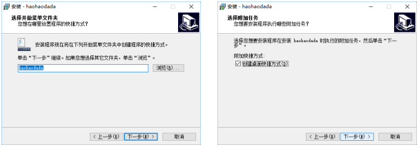 在如下左图所示的“选择开始菜单文件夹”对话框中,默认会在“开始”菜单文件夹生成一个名为“haohaodada”的程序组,一般不要改变。单击“下一步”按钮继续安装。