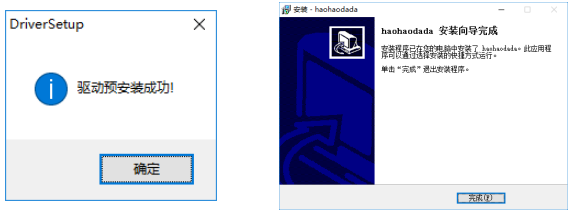 “好好搭搭”设备驱动程序安装完成后,会显示如下左图所示的对话框,单击“确定”按钮退出驱动安装程序。