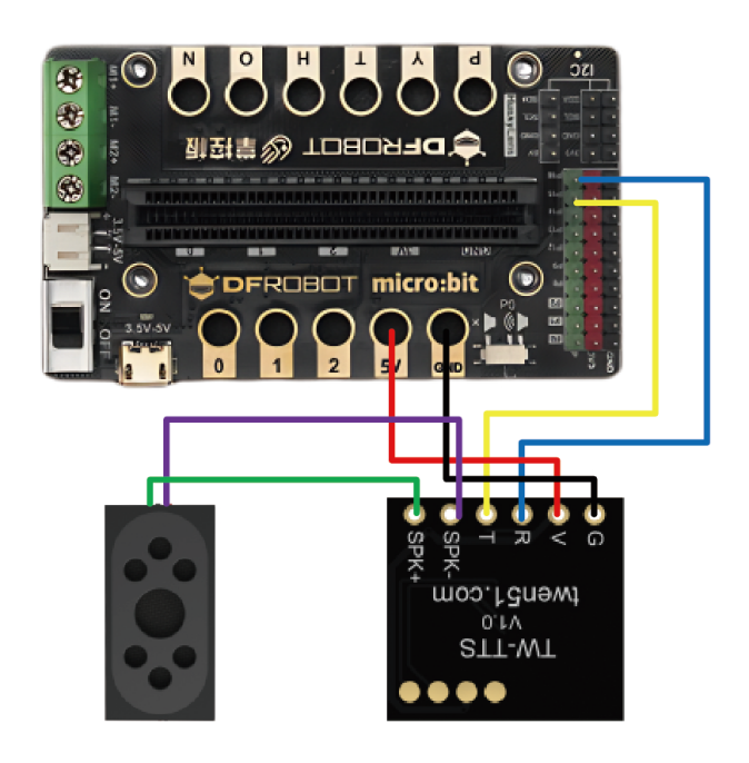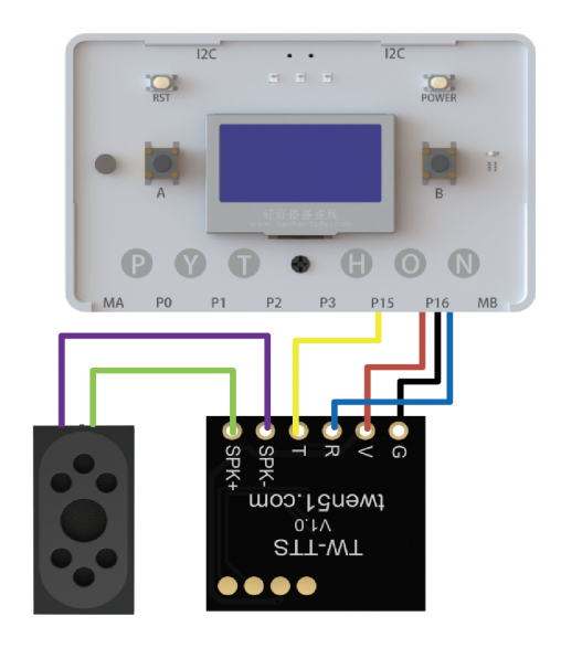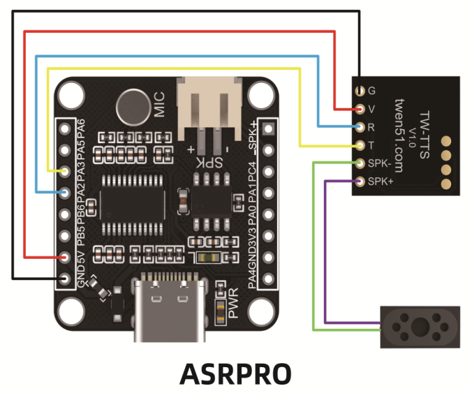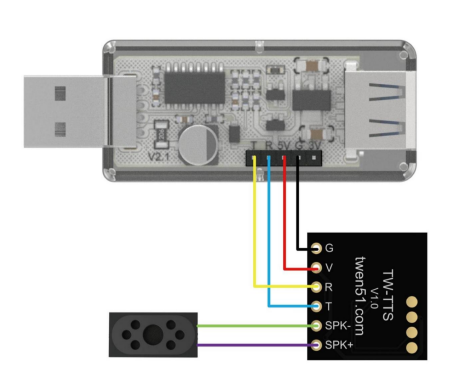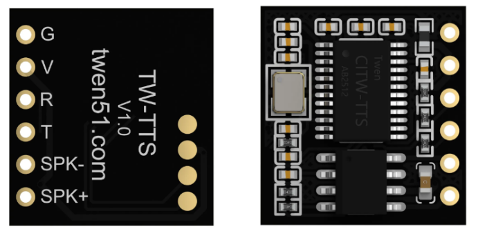 TW_TTS语音合成模块共有六个引脚,分别是: 地线:G,电源:V(3.6-5.5V),输入:R,输出:T 喇叭+:SPK+(红线)喇叭-:SPK-(黑线) TTS语音模块可以仅使用 G、V、R 三线连接方案,即可以满足基础的播报和控制功能;