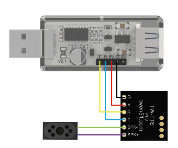 (串口助手复制粘贴使用) | 2、USB转TTL模块与TW-TTS模块连线首先将TW-TTS语音合成模块通过杜邦线连接到USB转TTL模块和喇叭,然后将USB转TTL模块连接到电脑的USB端口