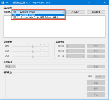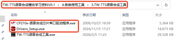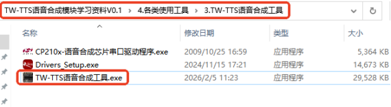 USB转TTL模块连线图 将USB转TTL模块的5V连接到TTS模块的V,USB转TTL模块的G连接到TTS模块的G,USB转TTL模块的T连接到TTS模块的R,USB转TTL模块的R连接到TTS模块的T,SPK+和SPK-分别连接到喇叭的红线和黑线,其他USB转TTL工具同理。 2、使用TW-TTS语音合成工具进行测试依次打开TW-TTS语音合成模块学习资料 --> 各类使用工具 --> TW-TTS语音合成工具中,找到TW-TTS语音合成工具并打开。
