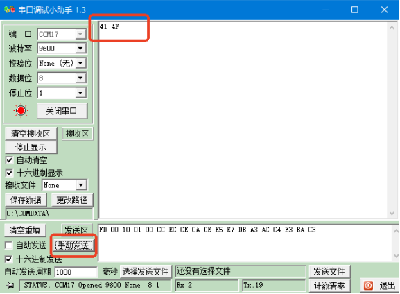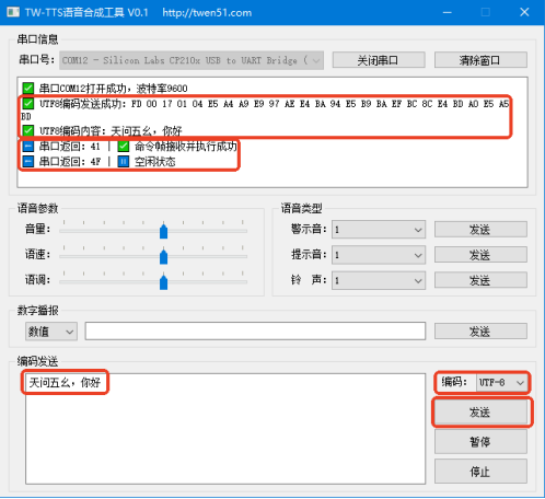最后点击手动发送---> 就可以从喇叭播报的“天问五幺,你好” ---> 接收区会依次收到TW-TTS模块回复的数据:41(收到正确命令帧) 4F(空闲状态,即播报完毕)