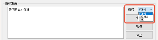 输入中文字符后,在下方字符编码中选择目标编码格式(GB18030和GB2312通用,选择GB18030或者UTF-8即可),格式选择十六进制,点击编码即可生成。建议添加一个空格为分隔符,再进行编码,方便后续测试时格式调整。 文本内容编码完成后需要根据生成文本的字节长度,补充帧头等完成整个发送命令帧。 GB2312格式的 “天问五幺,你好” 帧头 | 数据长度 | 命令字 | 编码参数 | 文本 | 0XFD | 0X00 0X10 | 0X01 | 0X00 | 0XCC 0XEC 0XCE 0XCA 0XCE 0XE5 0XE7 0XDB 0XA3 0XAC 0XC4 0XE3 0XBA 0XC3 | FD 00 10 01 00 CC EC CE CA CE E5 E7 DB A3 AC C4 E3 BA C3