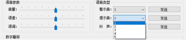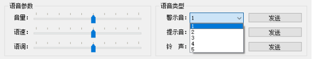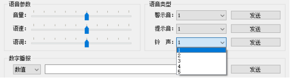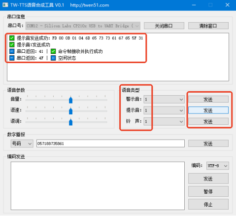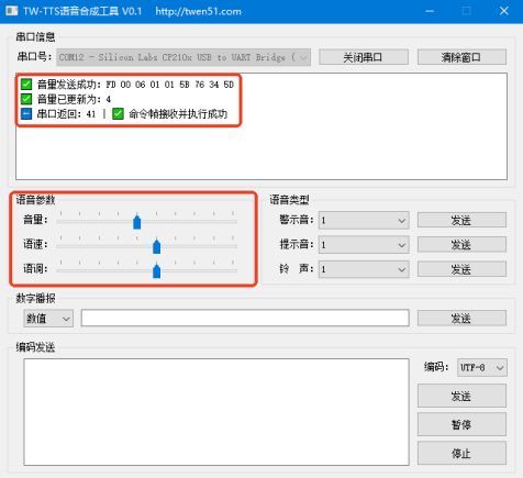 (1)文本输入直接播报 将文本比如“天问五幺,你好”直接输入或者粘贴到编码发送框中,选择编码格式,UTF-8、GB2312或者GBK,后续点击发送。 单击发送的同时,在软件的显示框中会显示“天问五幺,你好”的UTF-8格式完整的十六进制的编码命令帧,并展示编码文本内容。 同时会显示模块返回的数据,41(收到正确命令帧并执行)并从喇叭出听到播报的文本内容 播报完成后模块会迅速返回数据,4F(空闲状态)表示模块在空闲状态可以播报下一条指令。 文本合成播报支持任意简体中文,数字以及符号。 (2)语音参数调节 在模块空闲状态下可以自由调节音量、语速和语调,无需点击发送。 调节音量、语速和语调的同时,在软件的显示框中会依次显示调节内容的十六进制的编码命令帧(同本手册第四章第3-5小节的内容),并显示调节更新的内容。 同时会显示模块返回的数据,41(收到正确命令帧并执行)。 在播报长文本的同时也可以调节播报音量,语速和语调则必须在模块空闲状态下进行调节。 (3)数字、数值和中式号码播报 在数字播报右侧输入栏中输入想要播报的数字(进支持输入阿拉伯数字),在左侧选择想要合成播报的数字效果:数值、数值或者号码 播报数值、数值和号码的同时,在软件的显示框中会依次显示播报内容的十六进制的编码命令帧,并显示播报阿拉伯数字的内容。 同时会显示模块返回的数据,41(收到正确命令帧并执行)并从喇叭听到播报的数字内容。 播报完成后模块会迅速返回数据,4F(空闲状态)表示可以合成播报下一条指令。 数字:0(零),1(一),2(二),3(三),4(四),5(五),6(六),7(七),8(八),9(九) 数值:10(十),100(一百),1000(一千),10000(一万),100000(十万)......(一亿),播报数值最大为十亿以内,超过十亿会以数字形式播报。 号码:中文号码形式播报数字(只有1幺有差异,其他均与数字播报相同) 0(零),1(幺)2(二),3(三),4(四),5(五),6(六),7(七),8(八),9(九) (4)音效展示播报,选择并播报所有内置的音效,包含5种提示音、5种警示音和5种铃声。 警示音有5种