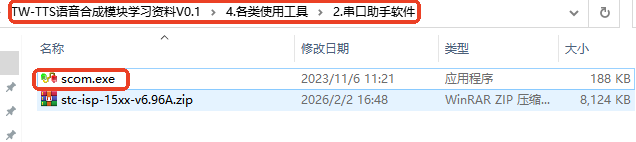 USB转TTL模块连线图 将USB转TTL模块的5V连接到TTS模块的V,USB转TTL模块的G连接到TTS模块的G,USB转TTL模块的T连接到TTS模块的R,USB转TTL模块的R连接到TTS模块的T,SPK+和SPK-分别连接到喇叭的红线和黑线; 3、使用串口助手进行测试将串口助手通过USB连接到电脑的USB端口 --> 打开学习资料文件夹 -->各类使用工具文件夹 --> 串口助手软件文件夹 -->打开 scom.exe