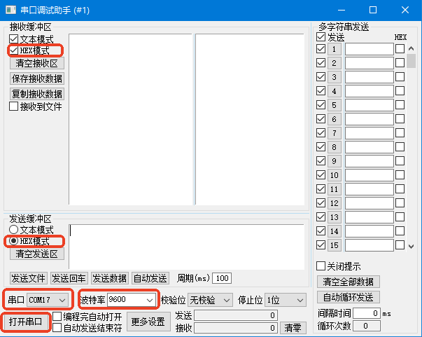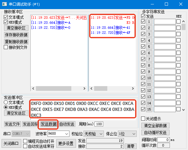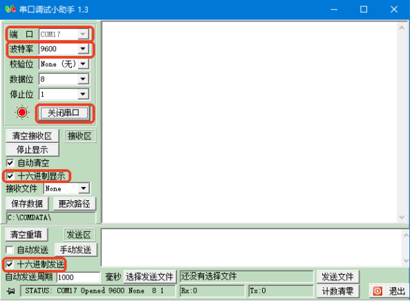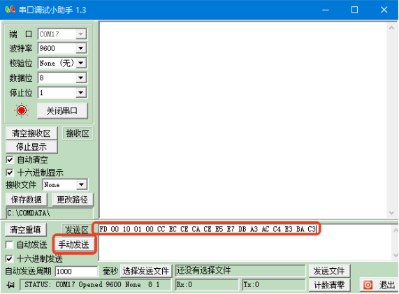 按照上图中的选项依次选择好,随后将上一小节制作的编码内容(串口助手不支持含0X字头的编码)复制粘贴到发送区的空白处(如果重新粘贴,由于快捷键占用的原因使用Ctrl+V无法粘贴,可以使用鼠标右键进行粘贴),再打开串口。