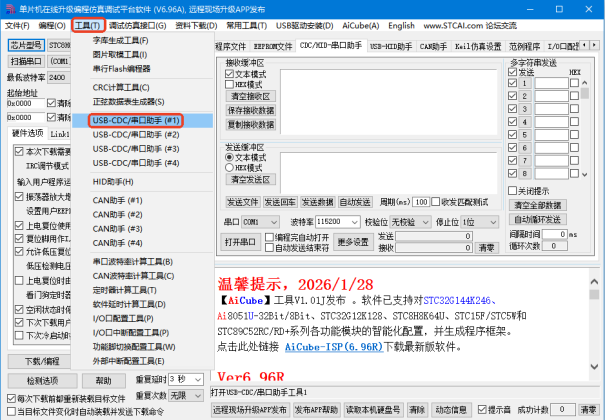 选择工具--> USB-CDC串口助手 依次打开接收缓冲区和发送缓冲区的hex模式 --> 选择波特率9600 --> 选择USB转TTL模块对应的USB端口号 --> 打开串口