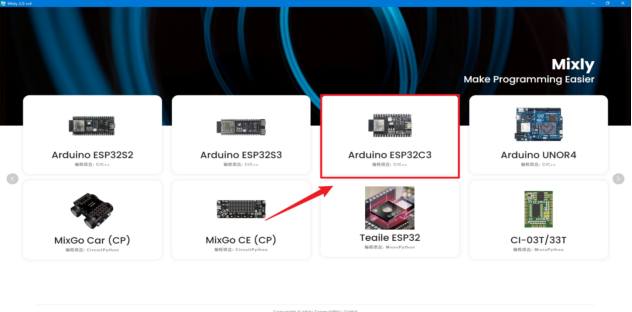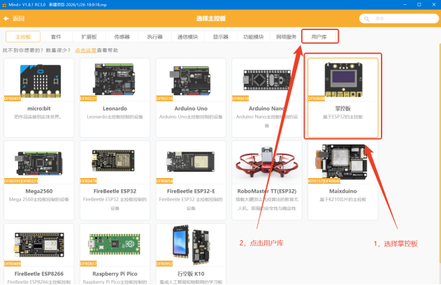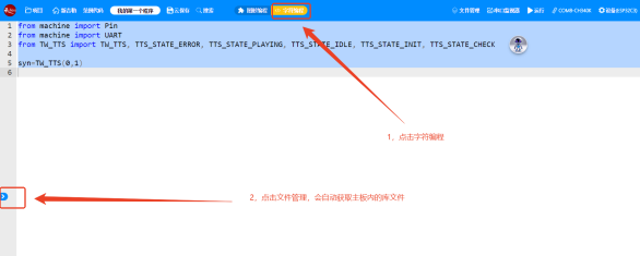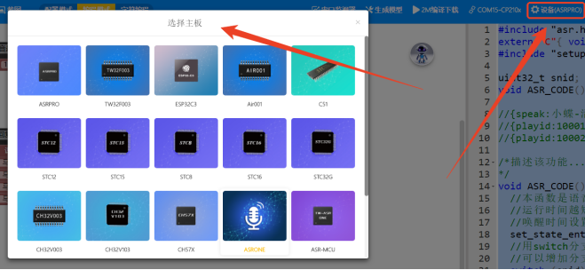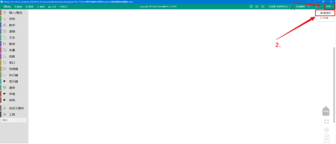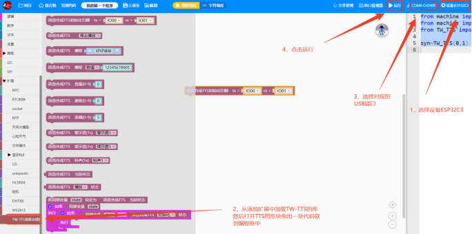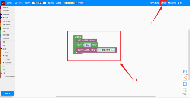 七、天问Block支持的芯片使用TW-TTS语音合成模块1、在天问Block上添加TW-TTS的库文件首先打开天问Block软件,点击右上角的“设备”,并选择您准备使用的主板。
