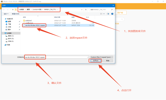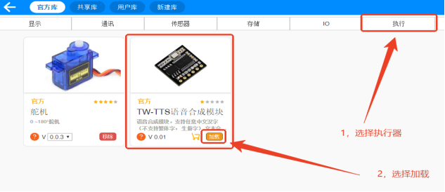在扩展界面中,在上边栏中选择“执行”找到TW-TTS语音合成模块的扩展库,点击加载。