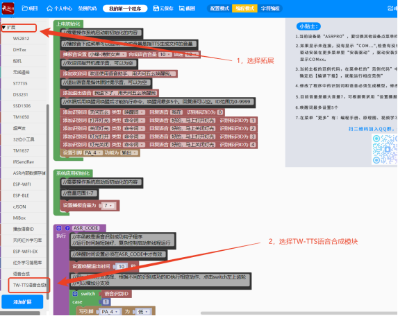 6、ASRPRO如何使用TW-TTS语音合成模块硬件连接 ESP32C3主板可用UART如下:Serial PB5和PB6,Serial1 PA2和PA3,Serial2 PA5和PA6;这里我们使用Serial1 PA2和PA3;ASRPRO的PA2(TX)引脚接TW_TTS的(R)引脚,ASRPRO的PA3(RX)引脚接TW_TTS的(T)引脚;5V引脚接TW-TTS的(V)引脚,GND引脚接TW-TTS的(G)引脚;TW-TTS的SPK+和SPK- 分别连接喇叭的+(红线)和-(黑线)。 图形块定义串口须知:
