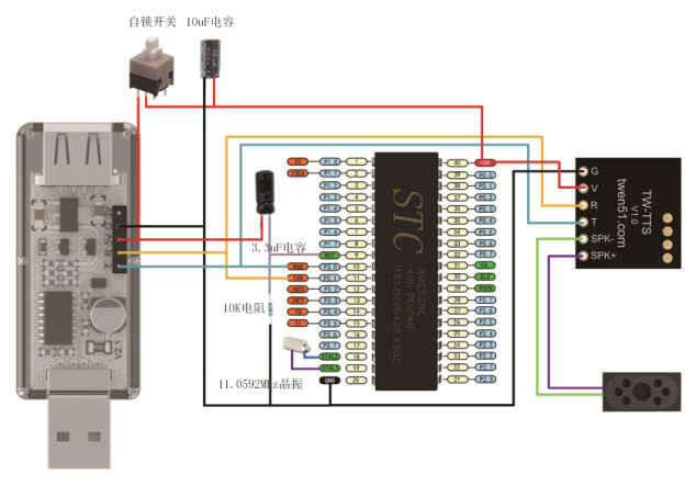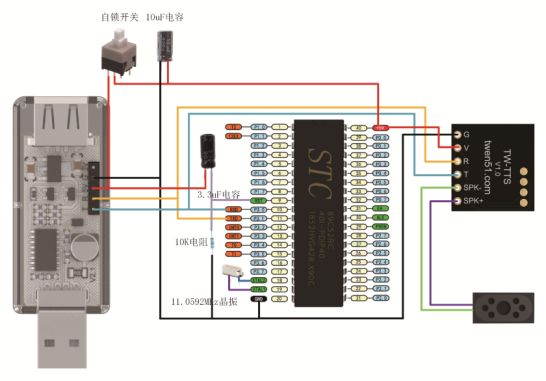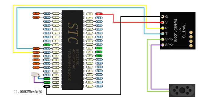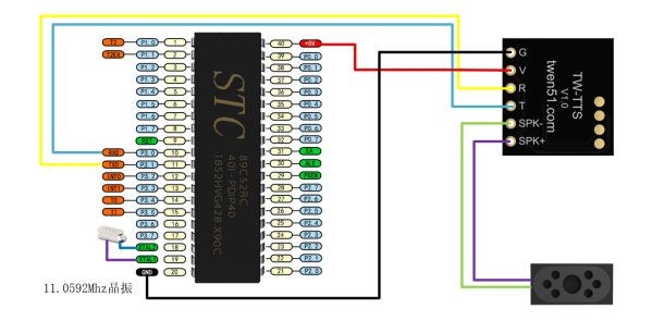 2、C51如何使用TW-TTS语音合成模块硬件连接 无扩展板使用C51系列裸芯片时,需要在芯片的18和19引脚处连接一个11.0592M的无源晶振才可以正常使用。 注意:C51串口只有TX(P3.1)和RX(P3.0),如连接TW-TTS模块的同时需要下载程序,需将TW-TTS的RX(P3.0)连接线拔掉才能正常下载程序。 TTS模块5V连接到C51芯片的40引脚(VCC),TTS模块的G连接到C51芯片的20号引脚(GND); TTS模块的T连接到C51芯片的10号引脚(P3.0),TTS模块的R连接到C51芯片的11号引脚(P3.1); TTS模块的SPK+和SPK- 分别连接喇叭的+(红线)和-(黑线)。 范例代码 (1)文本播报,天问五幺,你好; 实现效果:单片机上电自动播报:天问五幺,你好。