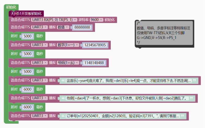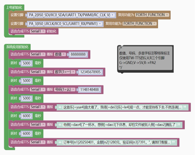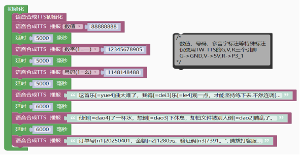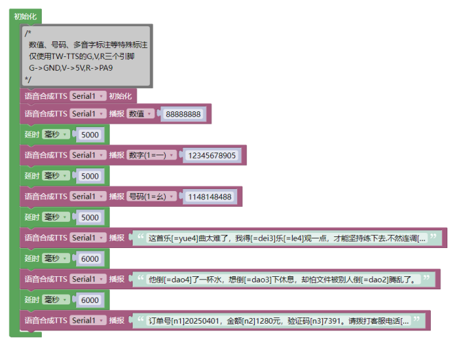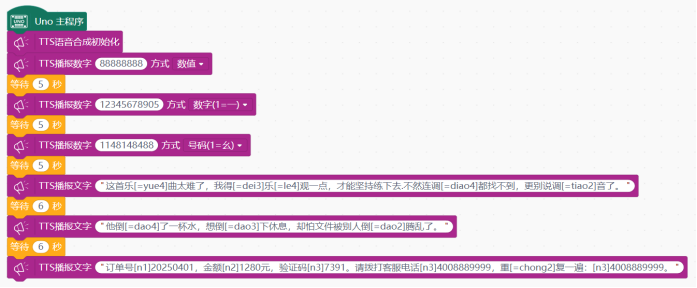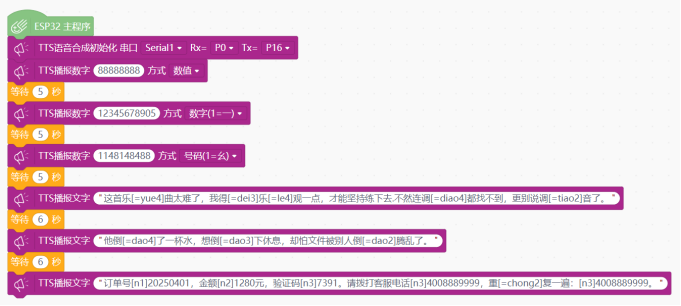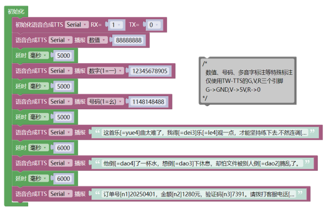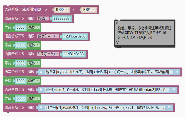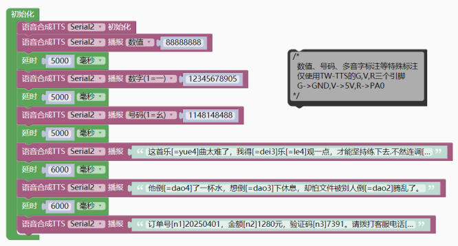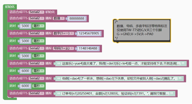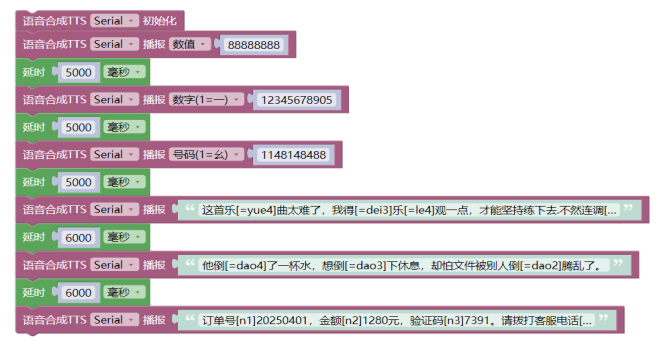 - tts_Serial.tts_play("订单号[n1]20250401,金额[n2]1280元,验证码[n3]7391。", 请拨打客服电话[n3]4008889999,重[=chong2]复一遍:[n3]4008889999。");