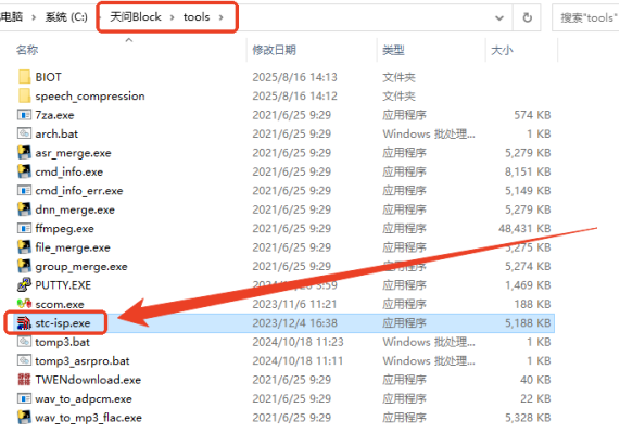 随后依次电脑上天问Block -->天问Block文件夹 --> tools -->打开 stc-isp.exe
